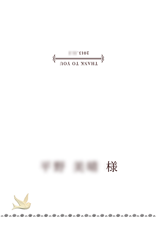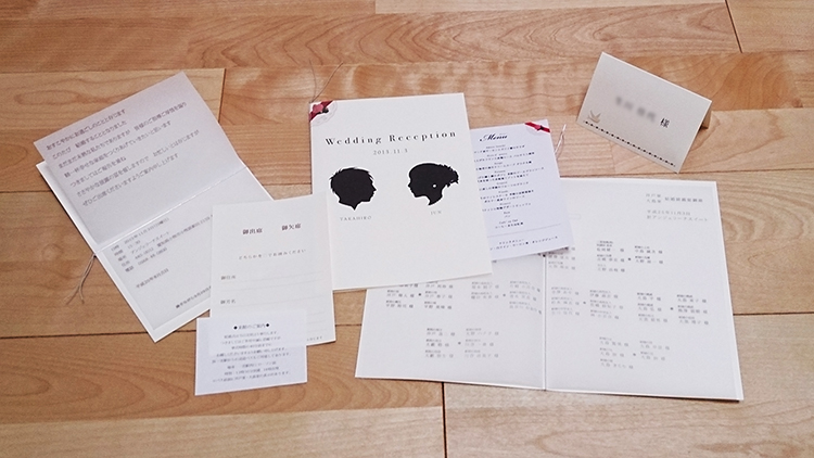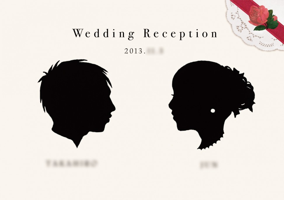 席次表や招待状は同じデザイン。 席札は裏にメッセージを書くそうなので、「THANK TO YOU」の文字。 シルエットは手書きにて作成。 招待状、メニュー