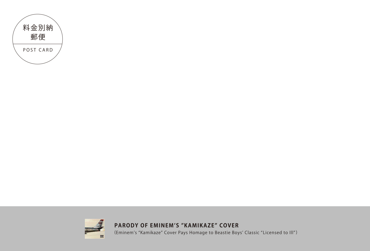 EMINEMのKAMIKAZEをパロディ。 シールドの絵を見せるこの構図が最初に浮かんでいて、パロディにする予定はなかったのだが… CDジャケットの飛行機と構図のマークⅢが同じ配色・同じ構図になっている事に気付いてからは、曲を聴きながら作業したこともあり、気持ちよくパロディする方向にシフトしてしまった。 宛名面にはしっかりその件と、このCDジャケット自体もさらにパロディであることも書いた。